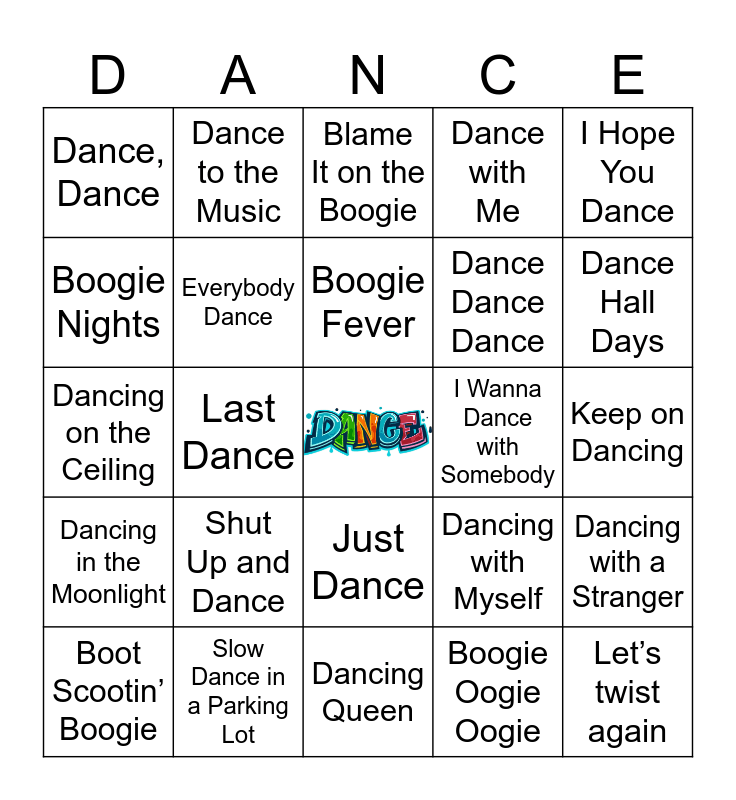 This bingo card has a free space and 45 words: Twist and shout, Let’s twist again, Slow dancing in a burning room, Boot Scootin’ Boogie, Boogie Shoes, Boogie Oogie Oogie, Blame It on the Boogie, Boogie Wonderland, I Hope You Dance, Slow Dance in a Parking Lot, Dance with Me, I Wanna Dance with Somebody, Just Dance, Shut Up and Dance, Dance Monkey, Dancing Queen, Dancing in the Dark, Dancing on the Ceiling, Dance with Me Tonight, Dance Hall Days, Dance to the Music, Dance the Night, Dance Away, Dance, Dance, You Should Be Dancing, Keep on Dancing, Still Dancing, Dancing Shoes, Dancing with Myself, Dancing in the Moonlight, Dancing Days, Dancing with a Stranger, Dancing in the Street, Dance with the One That Brought You, Dance with Me Molly, Last Dance, Safety Dance, Dance All Night, Boogie Woogie Bugle Boy, Boogie Fever, Boogie Nights, Dance Dance Dance, Dance for Me, Everybody Dance and We Danced.