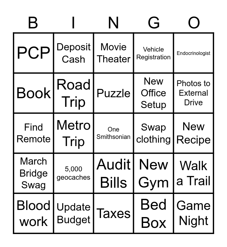 This bingo card has 25 words: 5,000 geocaches, Taxes, Puzzle, Blood work, Endocrinologist, PCP, Book, Deposit Cash, Swap clothing, Audit Bills, New Office Setup, Find Remote, New Gym, Walk a Trail, Road Trip, Game Night, New Recipe, Movie Theater, Photos to External Drive, Metro Trip, One Smithsonian, Update Budget, March Bridge Swag, Vehicle Registration and Bed Box.
