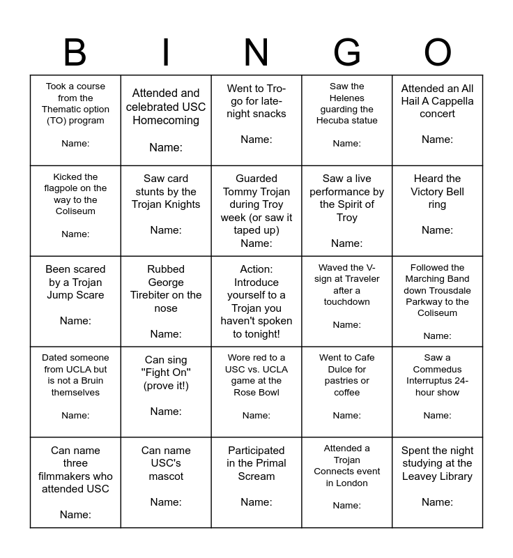 This bingo card has a free space and 24 words: Can sing ''Fight On'' (prove it!) Name:, Can name USC's mascot Name:, Guarded Tommy Trojan during Troy week (or saw it taped up) Name:, Can name three filmmakers who attended USC Name:, Attended an All Hail A Cappella concert Name:, Took a course from the Thematic option (TO) program Name:, Kicked the flagpole on the way to the Coliseum Name:, Attended and celebrated USC Homecoming Name:, Waved the V-sign at Traveler after a touchdown Name:, Wore red to a USC vs. UCLA game at the Rose Bowl Name:, Saw a live performance by the Spirit of Troy Name:, Been scared by a Trojan Jump Scare Name:, Went to Cafe Dulce for pastries or coffee Name:, Saw a Commedus Interruptus 24-hour show Name:, Saw card stunts by the Trojan Knights Name:, Attended a Trojan Connects event in London Name:, Followed the Marching Band down Trousdale Parkway to the Coliseum Name:, Went to Tro-go for late-night snacks Name:, Heard the Victory Bell ring Name:, Rubbed George Tirebiter on the nose Name:, Spent the night studying at the Leavey Library Name:, Dated someone from UCLA but is not a Bruin themselves Name:, Saw the Helenes guarding the Hecuba statue Name: and Participated in the Primal Scream Name:.