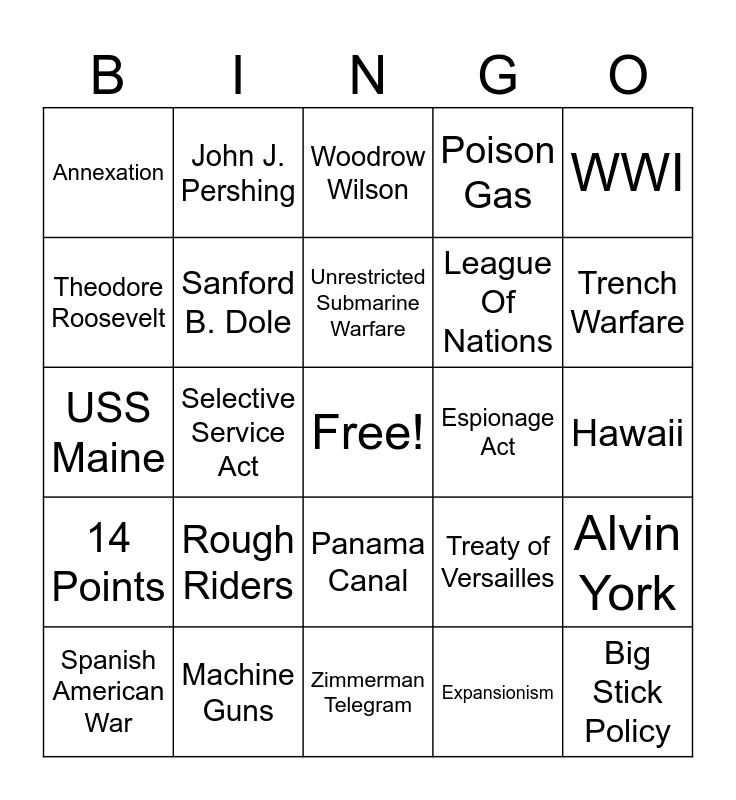 This bingo card has a free space and 29 words: Spanish American War, Archduke Franz Ferdinand, Selective Service Act, American Expeditionary Forces, Annexation, Woodrow Wilson, Sanford B. Dole, Rough Riders, Espionage Act, Machine Guns, Hawaii, Big Stick Policy, Zimmerman Telegram, Expansionism, Trench Warfare, Puerto Rico, Panama Canal, 14 Points, WWI, USS Maine, Treaty of Versailles, Lusitania, League Of Nations, Theodore Roosevelt, Poison Gas, John J. Pershing, Alvin York, Unrestricted Submarine Warfare and Philippines.