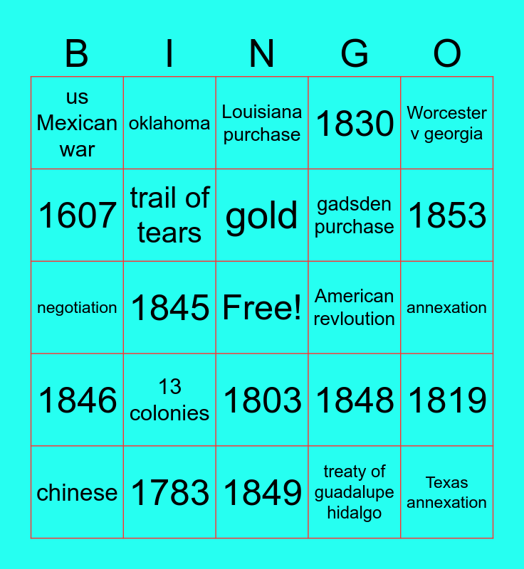 This bingo card has a free space and 24 words: chinese, 13 colonies, gold, treaty of guadalupe hidalgo, Worcester v georgia, us Mexican war, oklahoma, Louisiana purchase, American revloution, annexation, negotiation, trail of tears, 1848, 1819, 1607, 1783, 1849, 1830, 1853, 1846, 1845, 1803, gadsden purchase and Texas annexation.