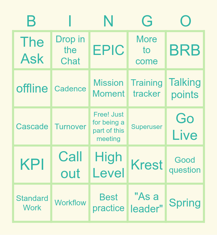 This bingo card has a free space and 24 words: Standard Work, Call out, Mission Moment, "As a leader", BRB, The Ask, Drop in the Chat, EPIC, Superuser, Go Live, Cascade, Cadence, Krest, Good question, offline, Workflow, Best practice, More to come, Talking points, KPI, Turnover, High Level, Training tracker and Spring.