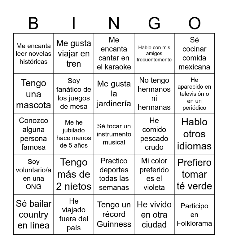 This bingo card has a free space and 24 words: Tengo más de 2 nietos, He viajado fuera del país, Me gusta la jardinería, Sé bailar country en línea, Sé cocinar comida mexicana, Me encanta leer novelas históricas, Tengo una mascota, Me gusta viajar en tren, He comido pescado crudo, Practico deportes todas las semanas, No tengo hermanos ni hermanas, Conozco alguna persona famosa, Mi color preferido es el violeta, Prefiero tomar té verde, Soy fanático de los juegos de mesa, He vivido en otra ciudad, Hablo otros idiomas, Me encanta cantar en el karaoke, He aparecido en televisión o en un periódico, Me he jubilado hace menos de 5 años, Participo en Folklorama, Soy voluntario/a en una ONG, Hablo con mis amigos frecuentemente and Tengo un récord Guinness.
