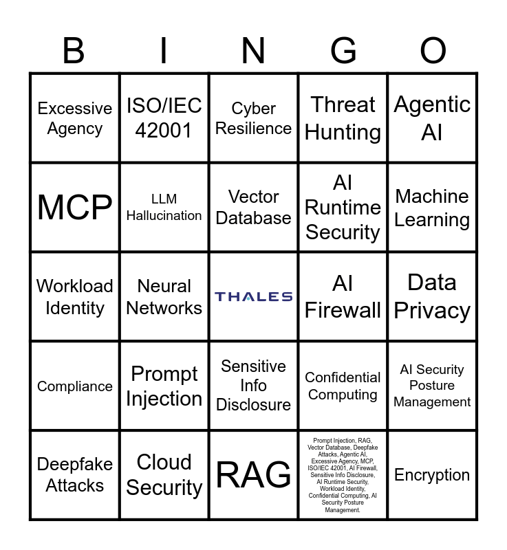 This bingo card has a free space and 25 words: Prompt Injection, RAG, Vector Database, Deepfake Attacks, Agentic AI, Excessive Agency, MCP, ISO/IEC 42001, AI Firewall, Sensitive Info Disclosure, AI Runtime Security, Workload Identity, Confidential Computing, AI Security Posture Management, LLM Hallucination, Zero Trust, Data Privacy, Cyber Resilience, Machine Learning, Neural Networks, Encryption, Cloud Security, Compliance, Threat Hunting and Prompt Injection, RAG, Vector Database, Deepfake Attacks, Agentic AI, Excessive Agency, MCP, ISO/IEC 42001, AI Firewall, Sensitive Info Disclosure, AI Runtime Security, Workload Identity, Confidential Computing, AI Security Posture Management..