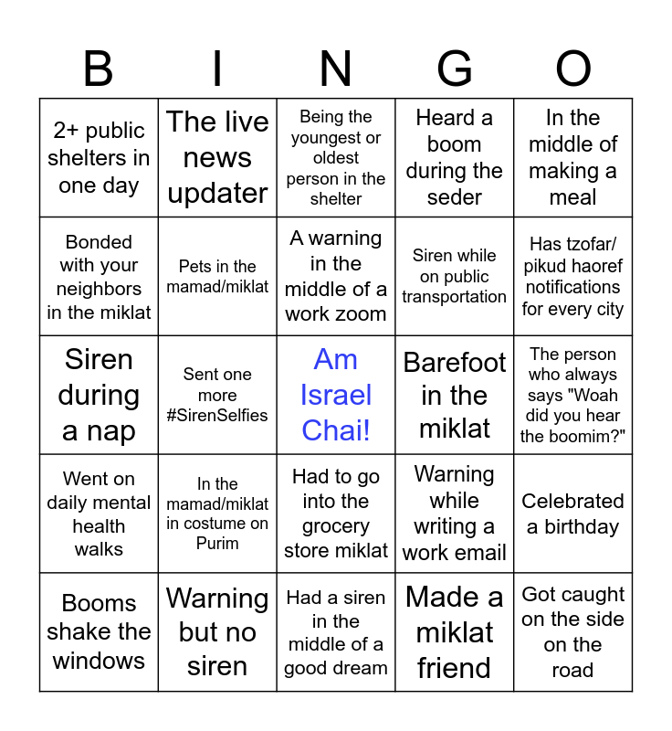 This bingo card has a free space and 24 words: In the mamad/miklat in costume on Purim, Warning but no siren, A warning in the middle of a work zoom, Booms shake the windows, In the middle of making a meal, 2+ public shelters in one day, Bonded with your neighbors in the miklat, The live news updater, Barefoot in the miklat, Had to go into the grocery store miklat, Siren while on public transportation, Siren during a nap, Warning while writing a work email, Celebrated a birthday, Pets in the mamad/miklat, Made a miklat friend, The person who always says "Woah did you hear the boomim?", Being the youngest or oldest person in the shelter, Has tzofar/ pikud haoref notifications for every city, Sent one more #SirenSelfies, Got caught on the side on the road, Went on daily mental health walks, Heard a boom during the seder and Had a siren in the middle of a good dream.