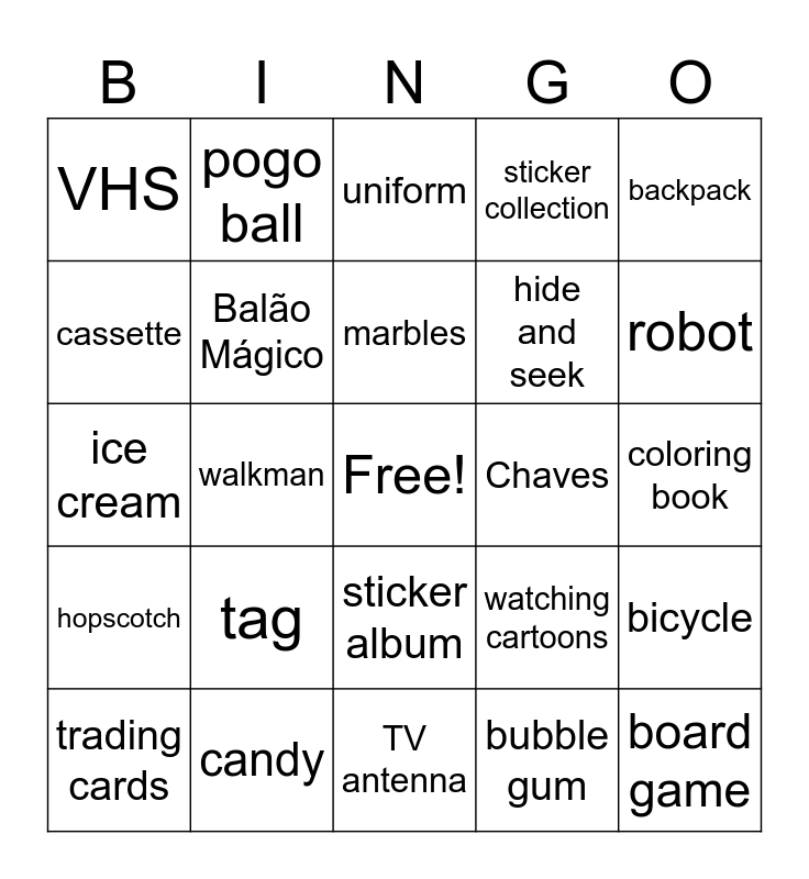 This bingo card has a free space and 66 words: doll, action figure, teddy bear, bicycle, skateboard, roller skates, pogo ball, yo-yo, marbles, kite, sticker album, crayons, coloring book, backpack, lunchbox, cassette, walkman, VHS, video game, hide and seek, tag, hopscotch, sticker collection, jump rope, playing outside, climbing trees, sleepover, birthday party, board game, arcade, trading cards, collecting, building blocks, drawing, watching cartoons, candy, chocolate, ice cream, bubble gum, Xou da Xuxa, Balão Mágico, TV Colosso, Chaves, Os Trapalhões, superhero, cartoon, robot, dinosaur, space, princess, monster, classroom, homework, recess, best friend, notebook, pencil case, test, uniform, TV antenna, static screen, after-school TV, video rental, movie night, MTV and water gun.
