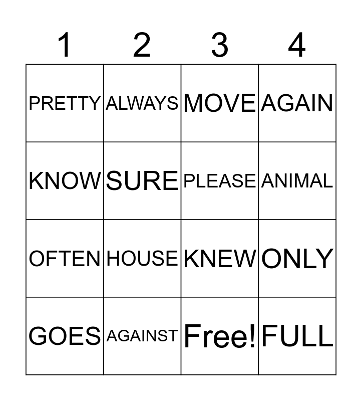 This bingo card has 17 words: Free!, GOES, MOVE, PRETTY, HOUSE, AGAIN, ONLY, PLEASE, ANIMAL, SURE, AGAINST, KNEW, KNOW, ALWAYS, OFTEN, ONCE and FULL.