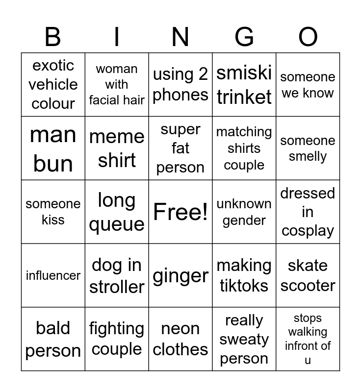 This bingo card has a free space and 24 words: dog in stroller, fighting couple, super fat person, bald person, someone we know, exotic vehicle colour, man bun, woman with facial hair, unknown gender, ginger, matching shirts couple, someone kiss, making tiktoks, skate scooter, meme shirt, really sweaty person, dressed in cosplay, using 2 phones, someone smelly, long queue, stops walking infront of u, influencer, smiski trinket and neon clothes.