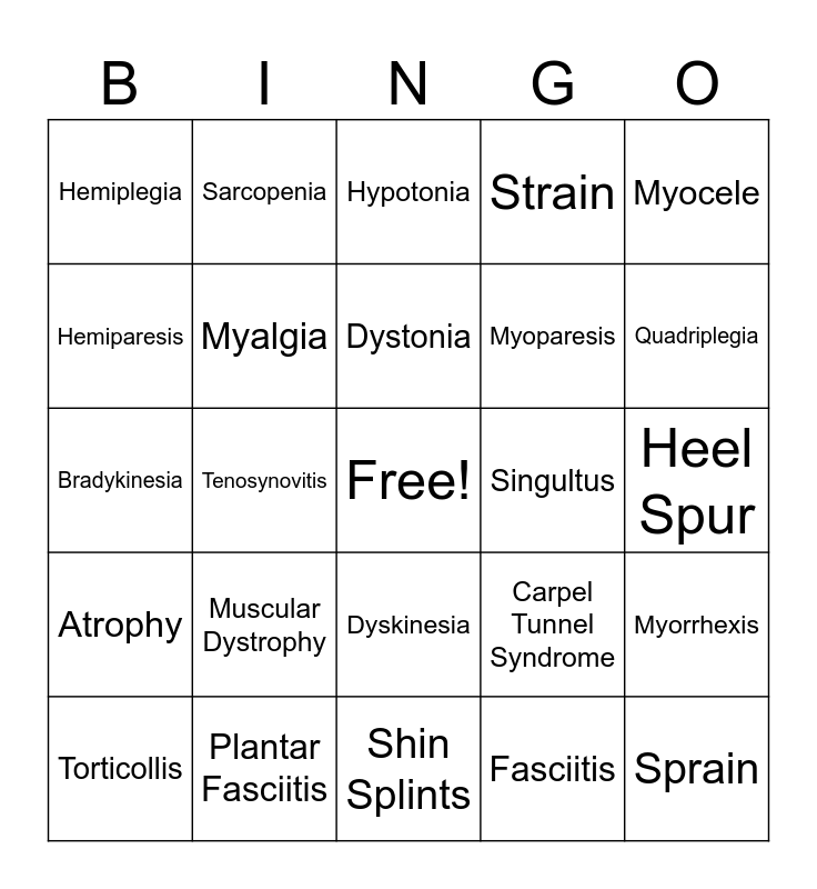 This bingo card has a free space and 32 words: Fasciitis, Fibromyalgia, Tenosynovitis, Tendinitis, Atrophy, Myalgia, Myocele, Myorrhexis, Sarcopenia, Atonic, Dystonia, Hypotonia, Ataxia, Spasm, Singultus, Cramp, Torticollis, Bradykinesia, Dyskinesia, Muscular Dystrophy, Carpel Tunnel Syndrome, Epicondylitis, Heel Spur, Plantar Fasciitis, Sprain, Strain, Myoparesis, Hemiparesis, Hemiplegia, Shin Splints, Paraplegia and Quadriplegia.