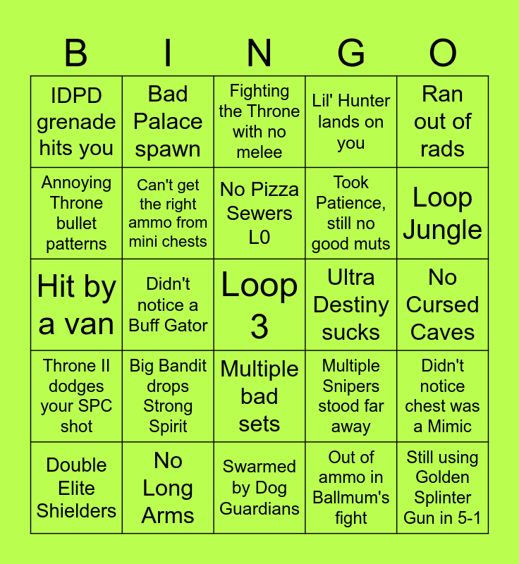 This bingo card has a free space and 24 words: Big Bandit drops Strong Spirit, No Long Arms, No Pizza Sewers L0, Double Elite Shielders, Ran out of rads, IDPD grenade hits you, Annoying Throne bullet patterns, Bad Palace spawn, Ultra Destiny sucks, Multiple bad sets, Took Patience, still no good muts, Hit by a van, Multiple Snipers stood far away, Didn't notice chest was a Mimic, Can't get the right ammo from mini chests, Out of ammo in Ballmum's fight, No Cursed Caves, Fighting the Throne with no melee, Loop Jungle, Didn't notice a Buff Gator, Still using Golden Splinter Gun in 5-1, Throne II dodges your SPC shot, Lil' Hunter lands on you and Swarmed by Dog Guardians.