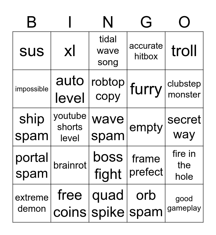 This bingo card has a free space and 24 words: brainrot, free coins, robtop copy, extreme demon, troll, sus, impossible, xl, empty, boss fight, furry, ship spam, frame prefect, fire in the hole, auto level, orb spam, secret way, tidal wave song, clubstep monster, youtube shorts level, good gameplay, portal spam, accurate hitbox and quad spike.