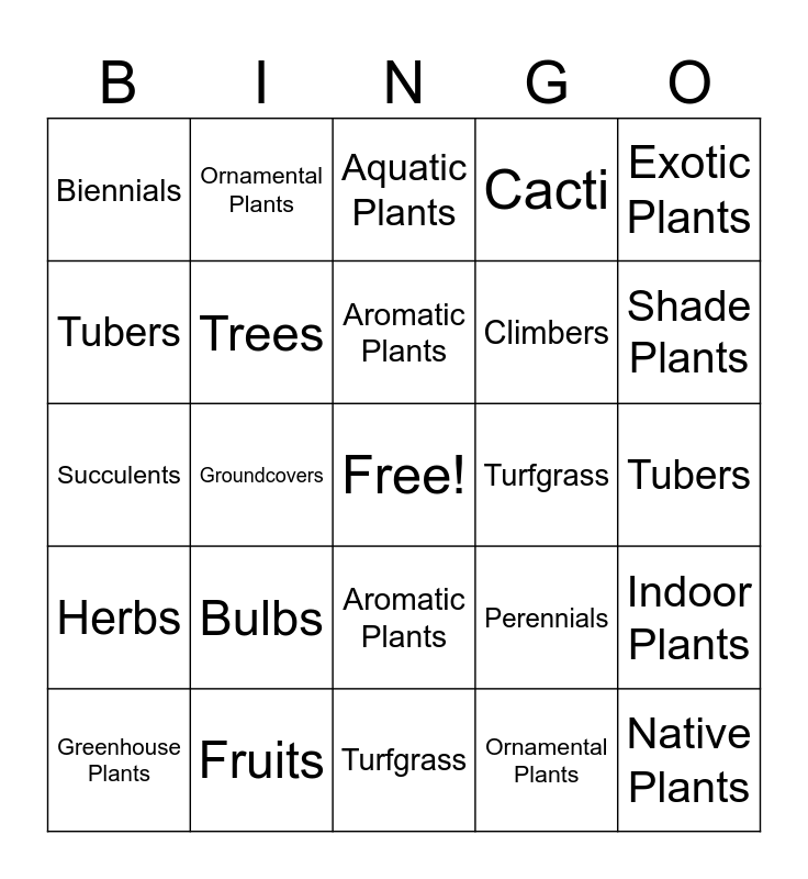 This bingo card has a free space and 61 words: Here is a vertical list of 30 horticultural categories without numbers:, Fruits, Vegetables, Herbs, Ornamental Plants, Shrubs, Trees, Groundcovers, Climbers, Succulents, Cacti, Bulbs, Tubers, Annuals, Perennials, Biennials, Native Plants, Exotic Plants, Medicinal Plants, Aromatic Plants, Turfgrass, Aquatic Plants, Greenhouse Plants, Indoor Plants, Container Plants, Landscape Plants, Native Pollinator Plants, Edible Landscaping Plants, Shade Plants, Sun-loving Plants, Drought-tolerant Plants, Fruits, Vegetables, Herbs, Ornamental Plants, Shrubs, Trees, Groundcovers, Climbers, Succulents, Cacti, Bulbs, Tubers, Annuals, Perennials, Biennials, Native Plants, Exotic Plants, Medicinal Plants, Aromatic Plants, Turfgrass, Aquatic Plants, Greenhouse Plants, Indoor Plants, Container Plants, Landscape Plants, Native Pollinator Plants, Edible Landscaping Plants, Shade Plants, Sun-loving Plants and Drought-tolerant Plants.