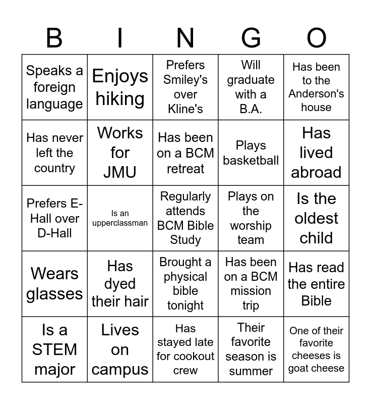This bingo card has a free space and 29 words: Is a STEM major, Has at least two pets, Is an upperclassman, Is an underclassman, Speaks a foreign language, Prefers Smiley's over Kline's, Works for JMU, Has dyed their hair, Plays on the worship team, Lives on campus, Is the oldest child, One of their favorite cheeses is goat cheese, Has stayed late for cookout crew, Their favorite season is summer, Has lived abroad, Is from out-of-state, Brought a physical bible tonight, Wears glasses, Has been to the Anderson's house, Prefers E-Hall over D-Hall, Has been on a BCM mission trip, Has broken a bone, Plays basketball, Has never left the country, Will graduate with a B.A., Enjoys hiking, Has read the entire Bible, Has been on a BCM retreat and Uses an android phone.