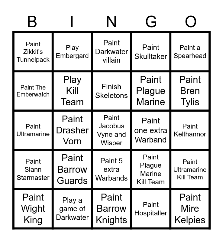 This bingo card has 25 words: Paint Barrow Guards, Paint Barrow Knights, Finish Skeletons, Paint Wight King, Paint a Spearhead, Paint Zikkit's Tunnelpack, Paint The Emberwatch, Play Embergard, Paint one extra Warband, Paint 5 extra Warbands, Paint Plague Marine, Paint Ultramarine, Paint Plague Marine Kill Team, Paint Ultramarine Kill Team, Play Kill Team, Paint Mire Kelpies, Paint Kelthannor, Paint Darkwater villain, Paint Bren Tylis, Paint Drasher Vorn, Paint Jacobus Vyne and Wisper, Play a game of Darkwater, Paint Slann Starmaster, Paint Skulltaker and Paint Hospitaller.