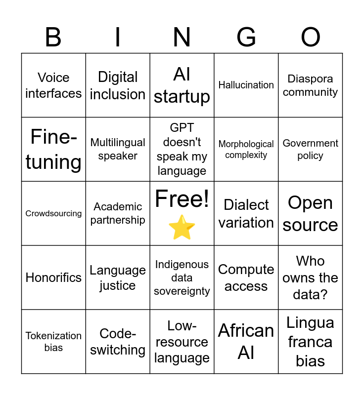 This bingo card has a free space and 42 words: "Low resource", GPT doesn't speak my language, Colonial legacy, Language justice, African AI, Who owns the data?, Lingua franca bias, Representation matters, AI startup, Indigenous data sovereignty, Open source, Government policy, Academic partnership, Diaspora community, Annotation labor, Compute access, Community datasets, Crowdsourcing, Speech-to-text, Digital inclusion, Fine-tuning, Multilingual models, Language documentation, Voice interfaces, Oral tradition, Tonal language, Morphological complexity, Script diversity, Language endangerment, Cultural context loss, Proverb translation, Honorifics, Multilingual speaker, Low-resource language, Data scarcity, Tokenization bias, Code-switching, Dialect variation, Transliteration, Out-of-vocabulary words, Hallucination and Training data imbalance.