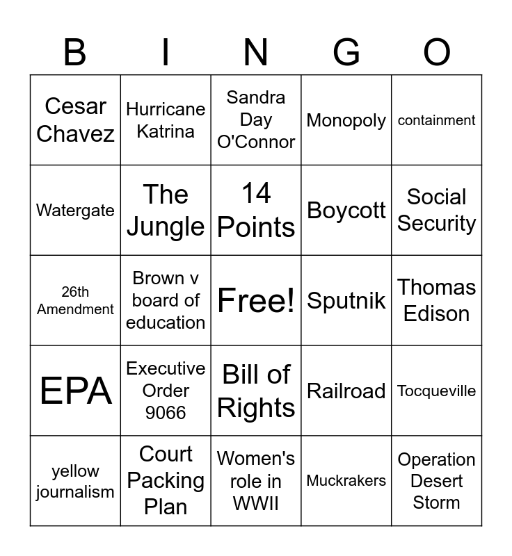 This bingo card has a free space and 76 words: Third time's the charm! Here is a final, completely fresh shuffle for your Bingo cards:, WWI Technology, Sandra Day O'Connor, The Red Scare, 15th Amendment, McCarthyism, Harlem Renaissance, Assembly Line/Mass manufacturing, Atomic bomb, Cold War, Japanese Internment Camps, 9/11, 14 Points, Watergate, Jane Addams, Brown v board of education, Unrestricted Submarine Warfare, Operation Desert Storm, Free Enterprise, containment, Prohibition, 26th Amendment, The Jungle, Hurricane Katrina, Monopoly, 19th Amendment, Jonas Salk, SQ Deal, Baby Boom/Suburbs, Black Panthers, Anti-war (Vietnam), Little rock 9, Militarism, Railroad, Social Security, Boycott, Pearl Harbor, Civic Responsibilities, Thomas Edison, Muckrakers, Chinese Exclusion Act, Imperialism, Vietnam War, Midway, Eisenhower, Panama Canal, yellow journalism, Cesar Chavez, FDIC, Space Race Technologies, Tuskegee Airmen, Bill of Rights, Push/Pull Factors, American Pop Culture, Urbanization, GI Bill, Sherman anti-trust Act, NAFTA, Berlin Airlift, Space Race, Executive Order 9066, Labor Unions, Unemployment, Treaty of Versailles, Homestead Act, Korean War, Sputnik, suffrage, Sonia Sotomayor, Domino Theory, Tocqueville, EPA, Court Packing Plan, Causes of WWII, Women's role in WWII and 24th Amendment.