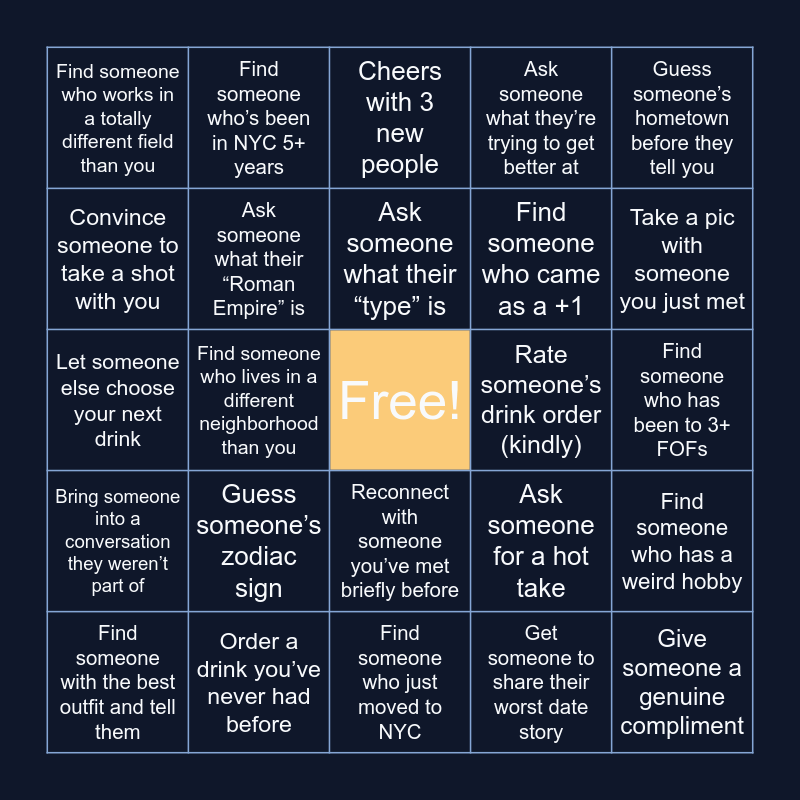 This bingo card has a free space and 24 words: Guess someone’s zodiac sign, Order a drink you’ve never had before, Ask someone what their “type” is, Find someone with the best outfit and tell them, Guess someone’s hometown before they tell you, Find someone who works in a totally different field than you, Convince someone to take a shot with you, Find someone who’s been in NYC 5+ years, Rate someone’s drink order (kindly), Reconnect with someone you’ve met briefly before, Find someone who came as a +1, Let someone else choose your next drink, Ask someone for a hot take, Find someone who has a weird hobby, Ask someone what their “Roman Empire” is, Get someone to share their worst date story, Find someone who has been to 3+ FOFs, Cheers with 3 new people, Take a pic with someone you just met, Find someone who lives in a different neighborhood than you, Give someone a genuine compliment, Bring someone into a conversation they weren’t part of, Ask someone what they’re trying to get better at and Find someone who just moved to NYC.