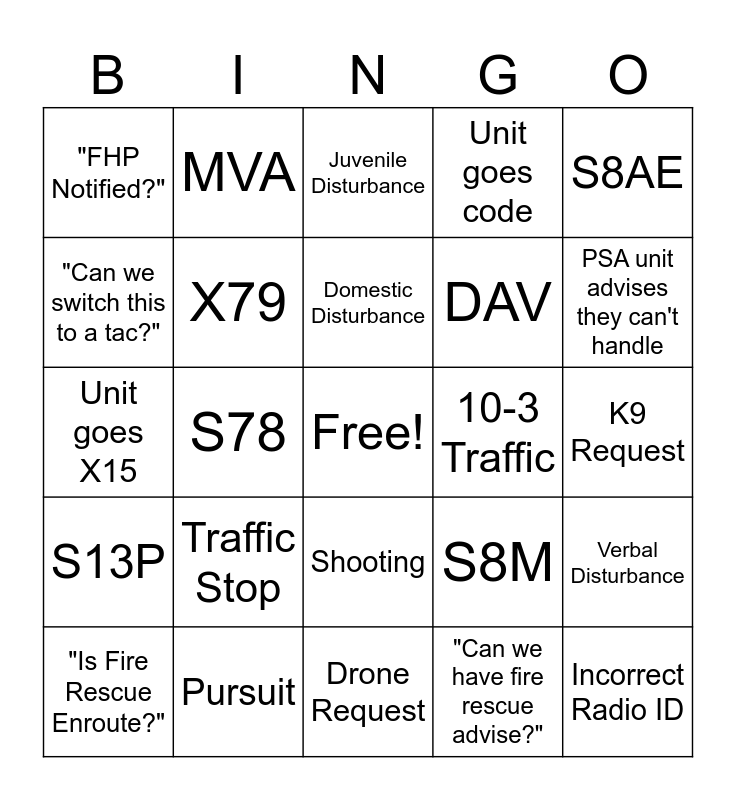 This bingo card has a free space and 24 words: Traffic Stop, Pursuit, Domestic Disturbance, "Is Fire Rescue Enroute?", S8AE, "FHP Notified?", "Can we switch this to a tac?", MVA, 10-3 Traffic, Shooting, DAV, Unit goes X15, S8M, Verbal Disturbance, X79, "Can we have fire rescue advise?", K9 Request, Juvenile Disturbance, PSA unit advises they can't handle, S78, Incorrect Radio ID, S13P, Unit goes code and Drone Request.