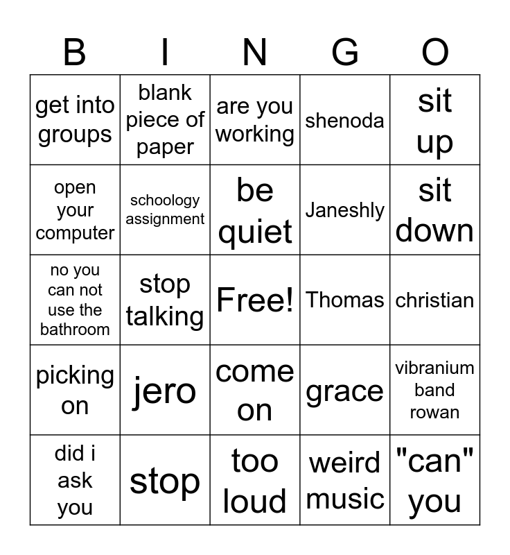 This bingo card has a free space and 24 words: jero, stop, be quiet, did i ask you, sit up, get into groups, open your computer, blank piece of paper, Thomas, come on, Janeshly, no you can not use the bathroom, grace, vibranium band rowan, schoology assignment, weird music, christian, are you working, sit down, stop talking, "can" you, picking on, shenoda and too loud.