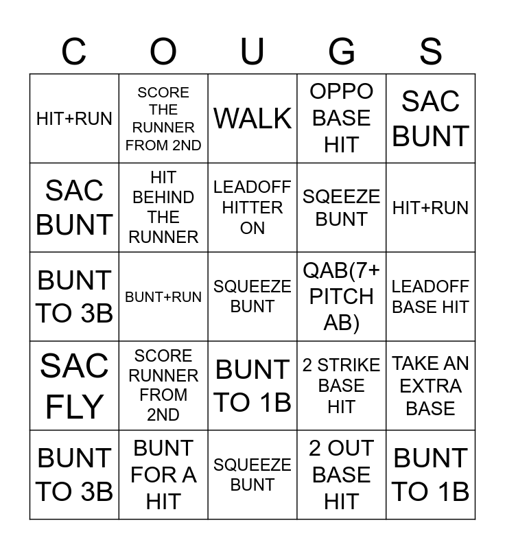 This bingo card has a free space and 24 words: SCORE RUNNER FROM 2ND, BUNT FOR A HIT, LEADOFF HITTER ON, BUNT TO 3B, SAC BUNT, HIT+RUN, SAC BUNT, SCORE THE RUNNER FROM 2ND, QAB(7+ PITCH AB), BUNT TO 1B, SQEEZE BUNT, BUNT TO 3B, 2 STRIKE BASE HIT, TAKE AN EXTRA BASE, HIT BEHIND THE RUNNER, 2 OUT BASE HIT, LEADOFF BASE HIT, WALK, HIT+RUN, BUNT+RUN, BUNT TO 1B, SAC FLY, OPPO BASE HIT and SQUEEZE BUNT.