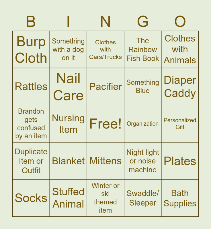 This bingo card has a free space and 34 words: First Aid Item, Swaddle/ Sleeper, Bottle Cleaner or Brush, Toy, Duplicate Item or Outfit, Nail Care, Clothes with Animals, Socks, Something with a dog on it, Bottle, Pacifier, Clothes with Cars/Trucks, Hat, Utensils, Organization, Diaper Caddy, Stuffed Animal, Brandon gets confused by an item, Blanket, Night light or noise machine, Mittens, Something Yellow, Burp Cloth, Personalized Gift, Winter or ski themed item, Bath Supplies, The Rainbow Fish Book, Bath Supplies, Something Blue, Rattles, Milestone or Memory Item, Nursing Item, Plates and Crowd Says "Aww".