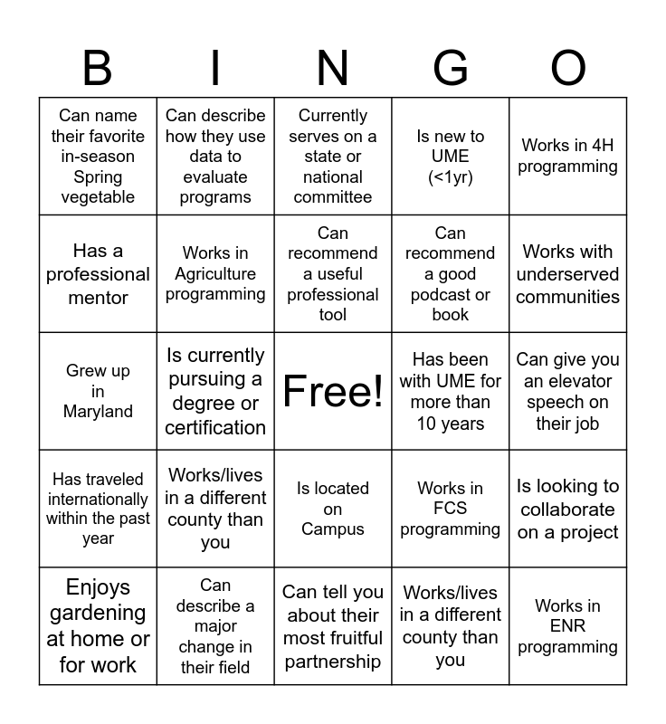 This bingo card has a free space and 25 words: Works/lives in a different county than you, Can tell you about their most fruitful partnership, Can recommend a useful professional tool, Enjoys gardening at home or for work, Works in 4H programming, Can name their favorite in-season Spring vegetable, Has a professional mentor, Can describe how they use data to evaluate programs, Has been with UME for more than 10 years, Is located on Campus, Can recommend a good podcast or book, Grew up in Maryland, Works in FCS programming, Is looking to collaborate on a project, Works in Agriculture programming, Secured funding this past year, Can give you an elevator speech on their job, Currently serves on a state or national committee, Works with underserved communities, Is currently pursuing a degree or certification, Works in ENR programming, Can describe a major change in their field, Has traveled internationally within the past year, Is new to UME (<1yr) and Works/lives in a different county than you.