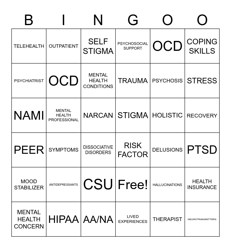 This bingo card has 36 words: Free!, CSU, LIVED EXPERIENCES, PSYCHIATRIST, PEER, STIGMA, OCD, AA/NA, OCD, HALLUCINATIONS, STRESS, PSYCHOSOCIAL SUPPORT, HEALTH INSURANCE, MENTAL HEALTH PROFESSIONAL, TRAUMA, TELEHEALTH, MOOD STABILIZER, HOLISTIC, NAMI, SELF STIGMA, NARCAN, SYMPTOMS, RISK FACTOR, DISSOCIATIVE DISORDERS, DELUSIONS, OUTPATIENT, PSYCHOSIS, HIPAA, MENTAL HEALTH CONDITIONS, COPING SKILLS, NEUROTRANSMITTERS, MENTAL HEALTH CONCERN, PTSD, RECOVERY, ANTIDEPRESSANTS and THERAPIST.