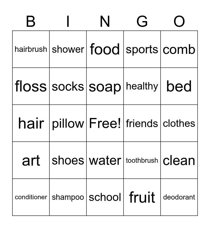 This bingo card has a free space and 24 words: shoes, shampoo, soap, conditioner, comb, hairbrush, floss, shower, friends, water, healthy, hair, toothbrush, clean, socks, fruit, clothes, food, bed, pillow, deodorant, art, sports and school.