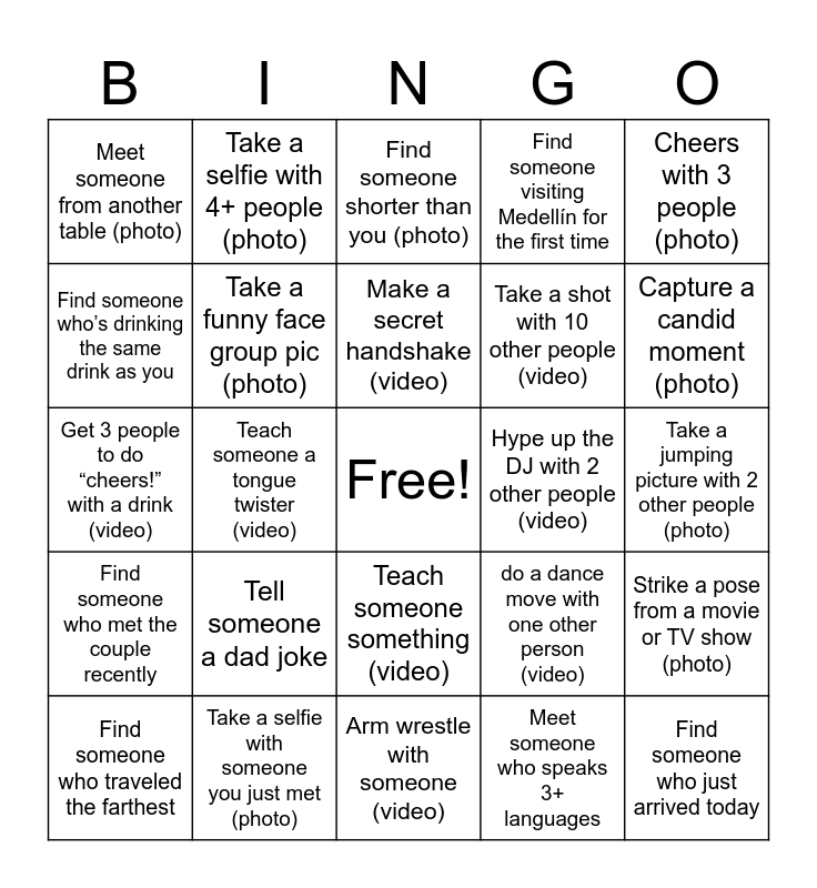 This bingo card has a free space and 24 words: Tell someone a dad joke, Take a selfie with someone you just met (photo), Make a secret handshake (video), Find someone who traveled the farthest, Cheers with 3 people (photo), Meet someone from another table (photo), Find someone who’s drinking the same drink as you, Take a selfie with 4+ people (photo), Hype up the DJ with 2 other people (video), Teach someone something (video), Take a shot with 10 other people (video), Get 3 people to do “cheers!” with a drink (video), do a dance move with one other person (video), Strike a pose from a movie or TV show (photo), Take a funny face group pic (photo), Meet someone who speaks 3+ languages, Take a jumping picture with 2 other people (photo), Find someone shorter than you (photo), Capture a candid moment (photo), Teach someone a tongue twister (video), Find someone who just arrived today, Find someone who met the couple recently, Find someone visiting Medellín for the first time and Arm wrestle with someone (video).
