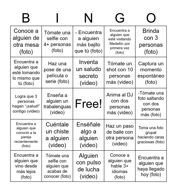 This bingo card has a free space and 24 words: Cuéntale un chiste a alguien (video), Tómate una selfie con alguien que acabas de conocer (foto), Inventa un saludo secreto (video), Encuentra a alguien que vino desde más lejos (foto), Brinda con 3 personas (foto), Conoce a alguien de otra mesa (foto), Encuentra a alguien que esté tomando lo mismo que tú (foto), Tómate una selfie con 4+ personas (foto), Anima al DJ con dos personas más (video), Enséñale algo a alguien (video), Tómate un shot con 10 personas más (video), Logra que 3 personas hagan “¡salud!” contigo (video), Haz un paso de baile con otra persona (video), Toma una foto grupal haciendo caras graciosas (foto), Haz una pose de una película o serie (foto), Conoce a alguien que hable 3+ idiomas (foto), -Tómate una foto saltando con dos personas más (foto), - Encuentra a alguien más bajito que tú (foto), Captura un momento espontáneo (foto), Enseña a alguien un trabalenguas (video), Encuentra a alguien que haya llegado hoy (foto), Encuentra a alguien que conoció a la pareja recientemente (foto), Encuentra a alguien que esté visitando Medellín por primera vez (foto) and Alguien con pulso de lucha (video).