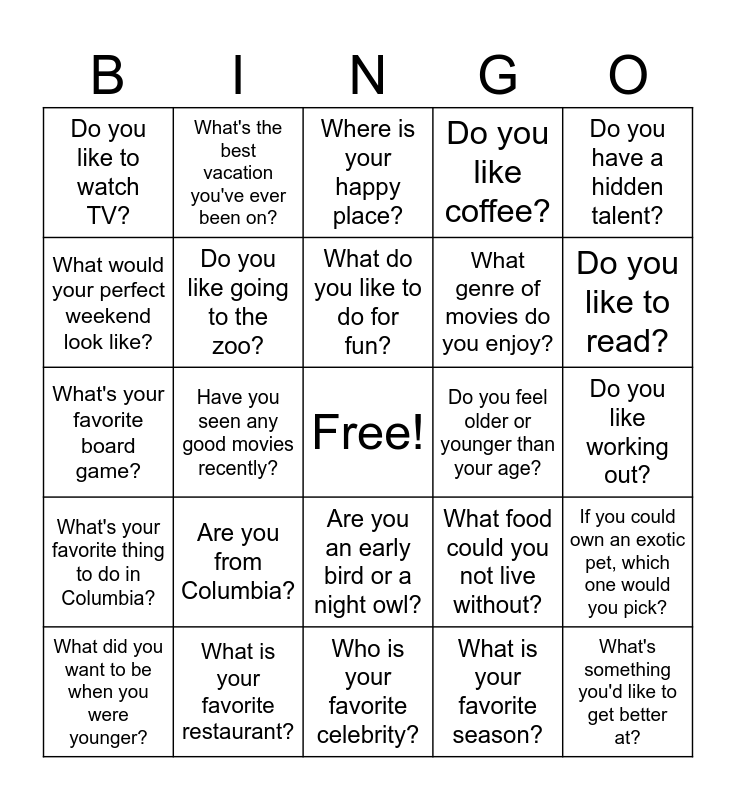 This bingo card has a free space and 24 words: Are you from Columbia?, What is your favorite restaurant?, What do you like to do for fun?, What did you want to be when you were younger?, Do you have a hidden talent?, Do you like to watch TV?, What would your perfect weekend look like?, What's the best vacation you've ever been on?, Do you feel older or younger than your age?, Are you an early bird or a night owl?, What genre of movies do you enjoy?, What's your favorite board game?, What food could you not live without?, If you could own an exotic pet, which one would you pick?, Do you like going to the zoo?, What is your favorite season?, Do you like working out?, Where is your happy place?, Do you like to read?, Have you seen any good movies recently?, What's something you'd like to get better at?, What's your favorite thing to do in Columbia?, Do you like coffee? and Who is your favorite celebrity?.