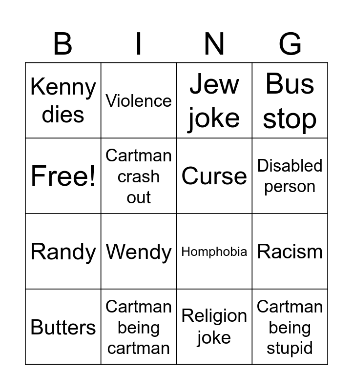 This bingo card has 16 words: Cartman being cartman, Racism, Jew joke, Kenny dies, Randy, Violence, Homphobia, Religion joke, Free!, Cartman crash out, Butters, Bus stop, Wendy, Disabled person, Curse and Cartman being stupid.