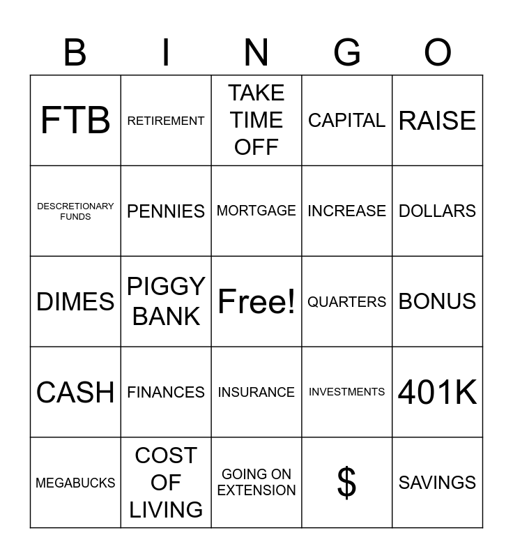This bingo card has a free space and 64 words: TAX DAY, REFUND, VACATION, 401K, ROTH IRA, SAVE FOR RAINY DAY, RETIREMENT, BUDGETING, MORTGAGE, RENT, INSURANCE, CAR PAYMENT, BONUS, RAISE, MONEY, DESCRETIONARY FUNDS, PIGGY BANK, FTB, IRS, INCREASE, FINANCES, CASH, CAPITAL, COINS, CURRENCY, RICHES, LUXURY ITEMS, WEALTH, FUNDS, GREEN, GOLD, SILVER, STOCKS, STOCK MARKET, DOLLARS, MEGABUCKS, DOUGH, $, CENTS, PENNIES, DIMES, QUARTERS, NICKLES, 2% MORE, $100 MONTH, SAVINGS, COST OF LIVING, LOTTERY, INVESTMENTS, SAVE FOR YOUR FUTURE, $50 BILL, TAX RETURN, GOING ON EXTENSION, DEDUCTIONS, INCOME TAX, PROPERTY TAXES, TAKE TIME OFF, HEALTH IS PRECIOUS, KEEP LEARNING, KIDS EDUCATION, PAY OFF DEBTS, PLAN FOR YOUR FUTURE, BUY A HOUSE and MAKE DONATIONS.
