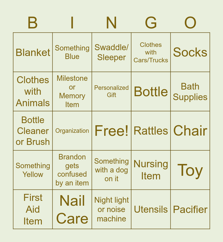 This bingo card has a free space and 34 words: Plates, Utensils, The Rainbow Fish Book, Bath Supplies, Something Yellow, Milestone or Memory Item, Socks, First Aid Item, Something Blue, Crowd Says "Aww", Personalized Gift, Swaddle/ Sleeper, Duplicate Item or Outfit, Winter or ski themed item, Rattles, Bath Supplies, Nail Care, Bottle Cleaner or Brush, Brandon gets confused by an item, Nursing Item, Something with a dog on it, Mittens, Blanket, Chair, Night light or noise machine, Pacifier, Clothes with Cars/Trucks, Hat, Bottle, Clothes with Animals, Burp Cloth, Organization, Toy and Stuffed Animal.