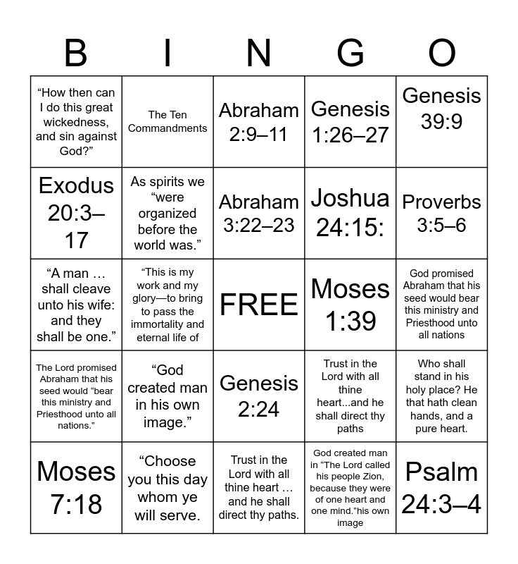 This bingo card has a free space and 24 words: “God created man in his own image.”, “Choose you this day whom ye will serve., Abraham 3:22–23, Moses 7:18, Genesis 39:9, “How then can I do this great wickedness, and sin against God?”, Exodus 20:3–17, The Ten Commandments, Moses 1:39, Genesis 2:24, Joshua 24:15:, “A man … shall cleave unto his wife: and they shall be one.”, Trust in the Lord with all thine heart...and he shall direct thy paths, Who shall stand in his holy place? He that hath clean hands, and a pure heart., As spirits we “were organized before the world was.”, God created man in “The Lord called his people Zion, because they were of one heart and one mind.”his own image, God promised Abraham that his seed would bear this ministry and Priesthood unto all nations, Abraham 2:9–11, Proverbs 3:5–6, “This is my work and my glory—to bring to pass the immortality and eternal life of, Psalm 24:3–4, The Lord promised Abraham that his seed would “bear this ministry and Priesthood unto all nations.”, Genesis 1:26–27 and Trust in the Lord with all thine heart … and he shall direct thy paths..
