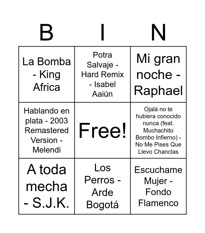 This bingo card has a free space and 85 words: Purpurina - Alberto Gambino, Chiquilla - Seguridad Social, Mi gran noche - Raphael, Zapatillas - El Canto Del Loco, Cuando zarpa el amor - Camela, Caminando por la vida - Melendi, Carolina - En directo 2000 - M-Clan, Princesas - Pereza, La Tortura (feat. Alejandro Sanz) - Shakira, La Camisa Negra - Juanes, Atrévete-Te-Te - Calle 13, Como Camarón - Estopa, A toda mecha - S.J.K., Física o química - Despistaos, Todos los días sale el sol - Bongo Botrako, La Bomba - King Africa, Gasolina - Daddy Yankee, Ojalá no te hubiera conocido nunca (feat. Muchachito Bombo Infierno) - No Me Pises Que Llevo Chanclas, Noche De Sexo - Wisin & Yandel, Fiesta Pagana - Mägo de Oz, Mari Carmen - La Pegatina, 20 de abril - Celtas Cortos, Clavado en Un Bar - Maná, La Cucaracha - El Combo Dominicano, Marta, Sebas, Guille y los demás - Amaral, Mon Amour - Remix - zzoilo, Tití Me Preguntó - Bad Bunny, I Gotta Feeling - Black Eyed Peas, Nunca volverá - El Sueño de Morfeo, El Fin del Mundo - La La Love You, Besos - El Canto Del Loco, Callaita - Bad Bunny, Una Vaina Loca - Fuego, Dale Don Dale - Don Omar, Puedes Contar Conmigo - La Oreja de Van Gogh, La Madre de Jose - El Canto Del Loco, Nada Fue Un Error - Coti, Tenía Tanto Que Darte - Nena Daconte, Paseo - Estopa, La Bilirrubina - Juan Luis Guerra 4.40, Pop - La Oreja de Van Gogh, Toda la noche en la calle - Amaral, Si Antes Te Hubiera Conocido - KAROL G, Tusa - KAROL G, Quevedo: Bzrp Music Sessions, Vol. 52/66 - Bizarrap, Nochentera - Vicco, Vagabundo - Sebastian Yatra, Ateo - C. Tangana, Dile - Don Omar, Mi Estrella Blanca - Fondo Flamenco, Potra Salvaje - Hard Remix - Isabel Aaiún, Los Perros - Arde Bogotá, Bailemos - Dani Fernández, El Principio de algo - La La Love You, Las Cosas Pequeñitas - Marta Santos, Inevitable - Shakira, Por quererte - Efecto Mariposa, Hablando en plata - 2003 Remastered Version - Melendi, SUPERESTRELLA - Aitana, La vereda de la puerta de atrás - Extremoduro, Sé lo que hicisteis - 2006 Remastered Version - Melendi, Ciega, Sordomuda - Shakira, Antes de que cuente diez - Fito y Fitipaldis, Bailando por Ahi - Juan Magán, Kisiera yo saber - Melendi, Escuchame Mujer - Fondo Flamenco, Diablo - Beret, Me has invitado a bailar - Dani Fernández, Por la boca vive el pez - Fito y Fitipaldis, No me crees - Efecto Mariposa, En El Muelle de San Blas - Maná, Días de verano - Amaral, La Suerte de Mi Vida - El Canto Del Loco, Aquellos Años Locos (Bonus Track) - El Canto Del Loco, Cada dos minutos (con Rulo y la Contrabanda y Kutxi Romero) - Despistaos, La primavera trompetera - Los Delinqüentes, Pan y mantequilla - Efecto Pasillo, Volvera - El Canto Del Loco, Que Te Quería - La Quinta Estacion, Las cosas pequeñitas - Nolasco, Estoy Aquí - Shakira, Volver a Disfrutar - El Canto Del Loco, La Plena - W Sound 05 - W Sound, Estrella Polar (with Juan Aguirre) - Pereza and Te entiendo - Pignoise.