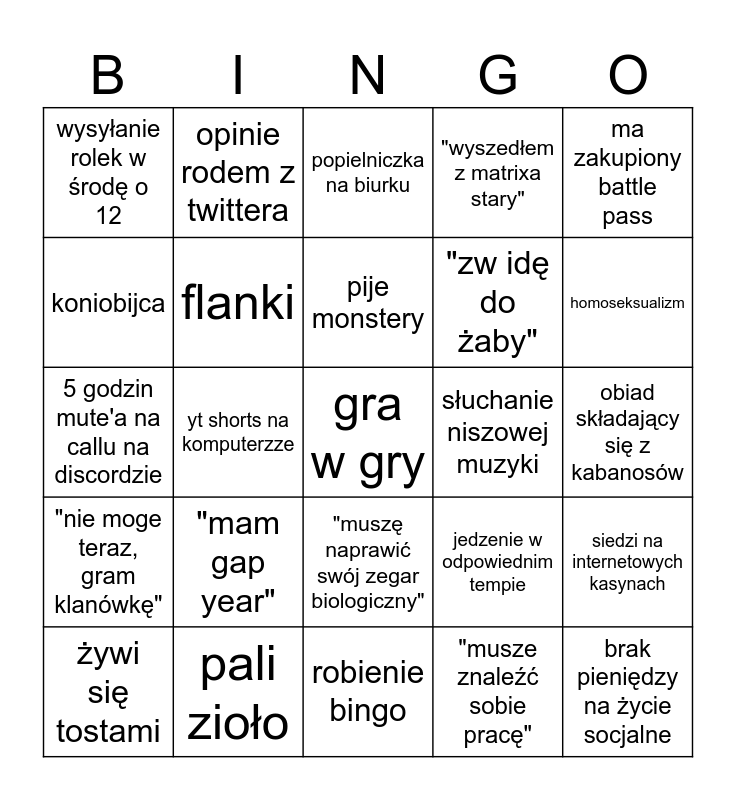This bingo card has a free space and 24 words: "mam gap year", pali zioło, pije monstery, żywi się tostami, ma zakupiony battle pass, wysyłanie rolek w środę o 12, koniobijca, opinie rodem z twittera, słuchanie niszowej muzyki, "muszę naprawić swój zegar biologiczny", "zw idę do żaby", 5 godzin mute'a na callu na discordzie, jedzenie w odpowiednim tempie, siedzi na internetowych kasynach, flanki, "musze znaleźć sobie pracę", obiad składający się z kabanosów, popielniczka na biurku, homoseksualizm, yt shorts na komputerzze, brak pieniędzy na życie socjalne, "nie moge teraz, gram klanówkę", "wyszedłem z matrixa stary" and robienie bingo.