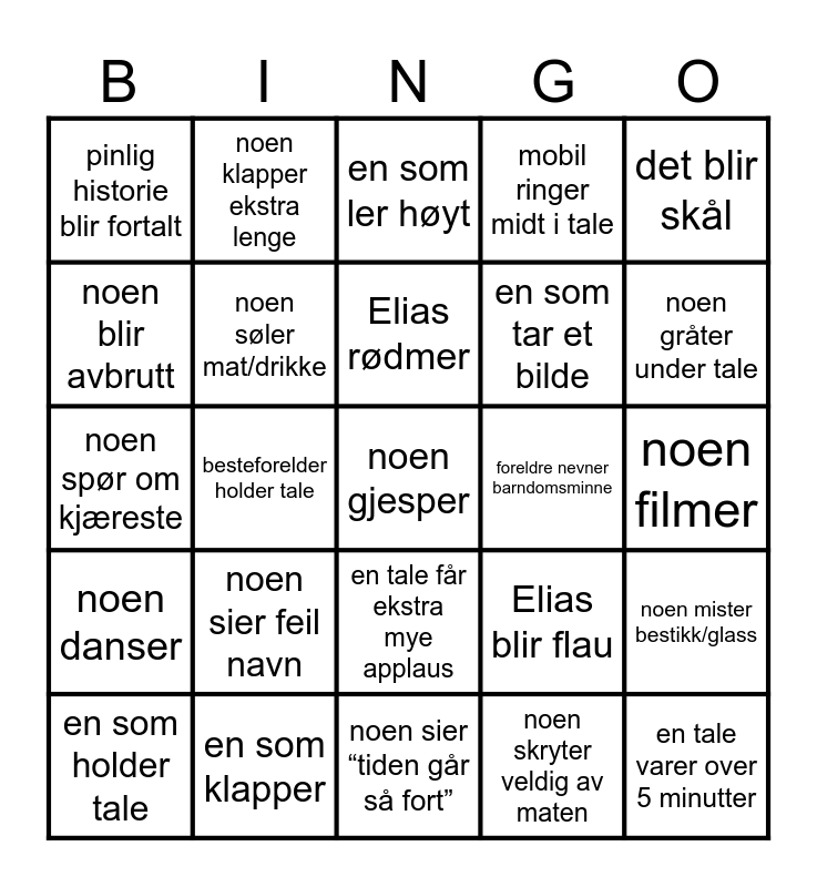 This bingo card has a free space and 24 words: en som holder tale, noen sier feil navn, Elias rødmer, noen skryter veldig av maten, det blir skål, pinlig historie blir fortalt, noen klapper ekstra lenge, en som ler høyt, foreldre nevner barndomsminne, noen filmer, noen spør om kjæreste, noen søler mat/drikke, Elias blir flau, noen mister bestikk/glass, noen blir avbrutt, en som klapper, noen sier “tiden går så fort”, mobil ringer midt i tale, noen gråter under tale, noen danser, besteforelder holder tale, en tale får ekstra mye applaus, en som tar et bilde and en tale varer over 5 minutter.