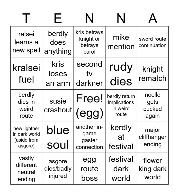 This bingo card has a free space and 24 words: blue soul, asgore dies/badly injured, second tv darkner, vastly different neutral ending, sword route continuation, ralsei learns a new spell, kralsei fuel, berdly does anything, berdly return implications in weird route, another in-game gaster connection, rudy dies, berdly dies in weird route, kerdly at festival, major cliffhanger ending, kris loses an arm, festival dark world, noelle gets cucked again, kris betrays knight or betrays carol, knight rematch, susie crashout, flower king dark world, new lightner in dark world (aside from asgore), mike mention and egg route boss.