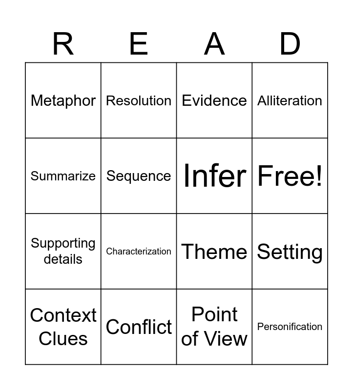 This bingo card has 18 words: Characterization, Personification, Evidence, Metaphor, Theme, Alliteration, Context Clues, Resolution, Free!, Supporting details, Point of View, Summarize, Setting, Sequence, Infer, Imagery, Conflict and Simile.