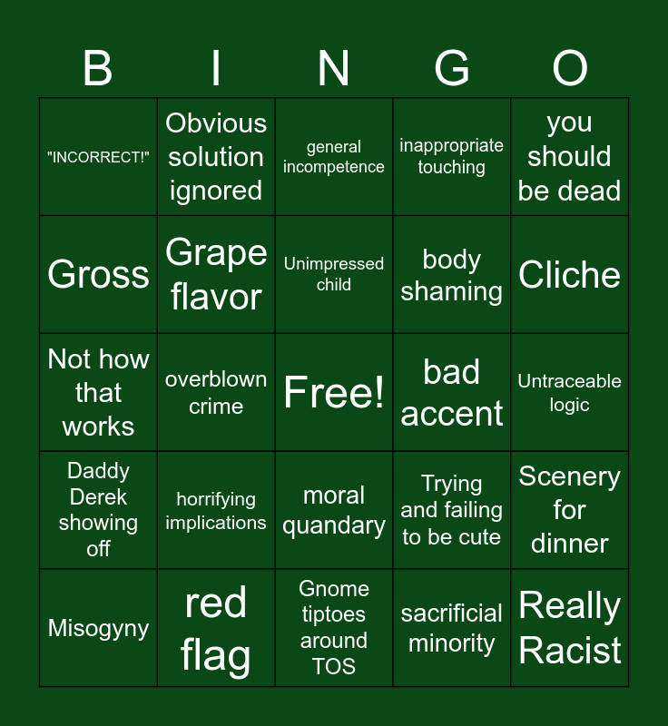 This bingo card has a free space and 43 words: Racist, Really Racist, Hate Crime, Misogyny, Super Misogyny, sacrificial minority, general incompetence, super incompetence, you should be dead, red flag, inappropriate touching, bad accent, moral quandary, horrifying implications, Child endangerment, Gnome tiptoes around TOS, cartoon physics, Not how that works, you should be dead, Cliche, Obvious solution ignored, Gnome is annoyed, really cheap prop, "INCORRECT!", Mountain out of molehill, Untraceable logic, Dark, Really Dark, Trying and failing to be cute, Daddy Derek showing off, power of friendship, Scenery for dinner, extra cheese moment, overblown crime, Punny name, Redemption, Overly emotional kid, Unimpressed child, Gross, body shaming, boomer humor, Grape flavor and Good message.