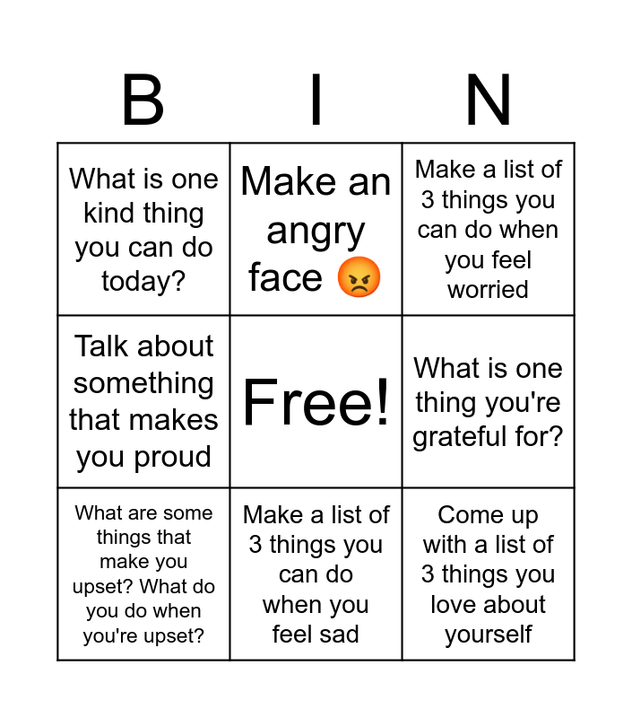 This bingo card has a free space and 24 words: Feelings Check-In! How do you feel today?, Set a goal for this week, Make a list of 3 things you can do when you feel sad, Practice a breathing exercise!, Come up with a list of 3 things you love about yourself, What is one kind thing you can do today?, What is one thing you're grateful for?, Make an angry face 😡, Someone took your pencil! What do you do?, Make a list of 3 things you can do when you feel angry, No one is playing with you at recess. What do you do?, Make an excited face 😁, Name 3 things that make a good friend, Talk about a place that makes you feel happy, What are some things that make you upset? What do you do when you're upset?, 5 things you see, 4 things you touch, 3 things you hear, 2 things you smell, 1 thing you taste, Your friend said something unkind to you. What do you do?, Make a list of 3 things you can do when you feel worried, You need an adult's help. Who can you ask?, Make a worried face 😬, You're working with a partner and you disagree with them. What do you do?, Uh oh. You said something that hurt your friend's feelings. How do you fix it?, Talk about something that makes you proud and Make a sad face 😰.