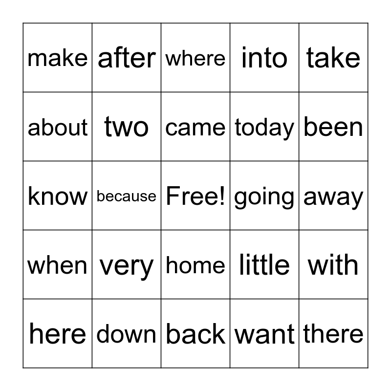 This bingo card has a free space and 24 words: very, down, came, here, take, make, about, after, going, home, today, know, little, with, two, want, away, where, been, because, there, when, into and back.