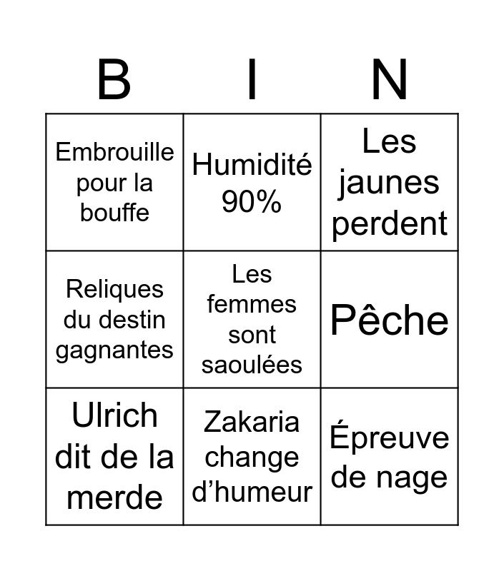 This bingo card has a free space and 8 words: Pêche, Les jaunes perdent, Humidité 90%, Ulrich dit de la merde, Embrouille pour la bouffe, Épreuve de nage, Reliques du destin gagnantes and Zakaria change d’humeur.