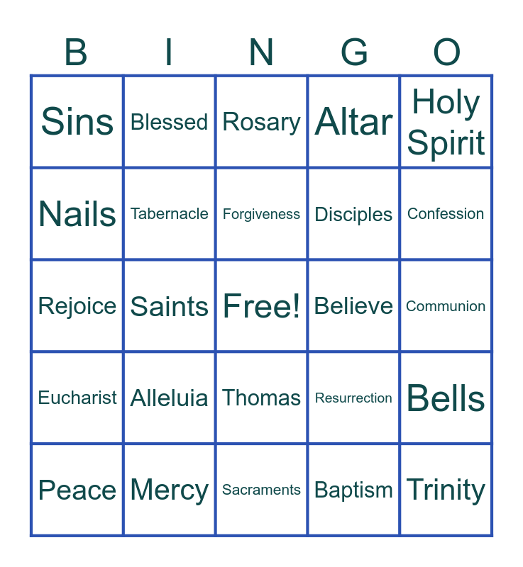 This bingo card has a free space and 24 words: Alleluia, Mercy, Forgiveness, Peace, Holy Spirit, Sins, Nails, Blessed, Believe, Thomas, Disciples, Rejoice, Resurrection, Bells, Tabernacle, Baptism, Communion, Rosary, Confession, Saints, Trinity, Eucharist, Altar and Sacraments.
