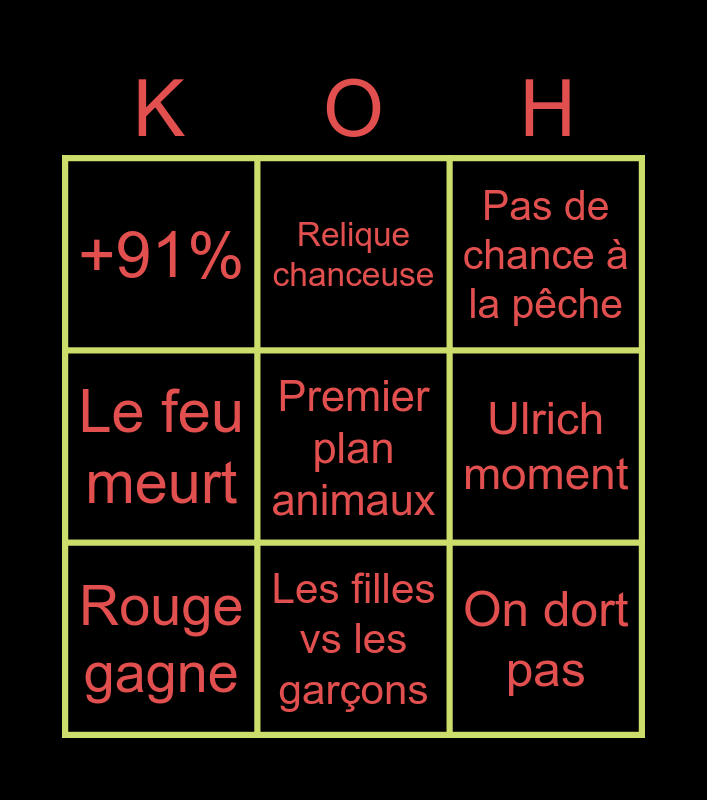 This bingo card has a free space and 8 words: Ulrich moment, Pas de chance à la pêche, Relique chanceuse, Rouge gagne, +91%, On dort pas, Le feu meurt and Les filles vs les garçons.
