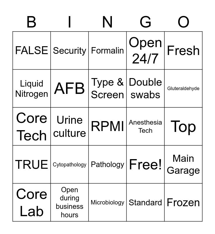 This bingo card has 25 words: Cytopathology, Microbiology, Type & Screen, Core Lab, Fresh, FALSE, Liquid Nitrogen, Security, Anesthesia Tech, Pathology, Double swabs, Core Tech, Free!, Main Garage, AFB, Frozen, Top, Formalin, Gluteraldehyde, Urine culture, RPMI, Open during business hours, TRUE, Open 24/7 and Standard.