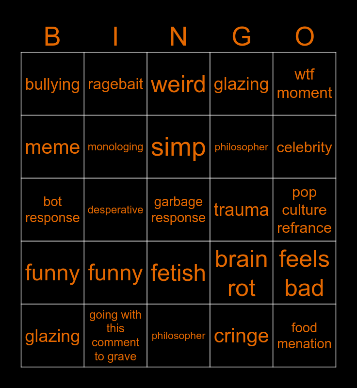 This bingo card has a free space and 24 words: funny, going with this comment to grave, simp, glazing, wtf moment, bullying, meme, ragebait, trauma, fetish, philosopher, bot response, brain rot, feels bad, monologing, cringe, pop culture refrance, weird, celebrity, desperative, food menation, funny, glazing and philosopher.