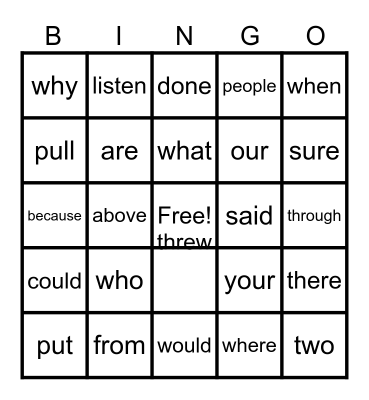 This bingo card has a free space and 24 words: put, who, what, where, when, why, listen, done, said, through, because, are, your, there, pull, from, would, people, sure, could, above, threw, our and two.