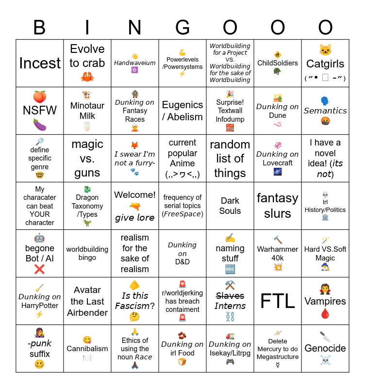 This bingo card has a free space and 50 words: ๐งVampires๐ฉธ, ๐๏ธ ๐๐ถ๐ฏ๐ฌ๐ช๐ฏ๐จ ๐ฐ๐ฏ Dune ๐ชฑ, ๐ช Delete Mercury to do Megastructure โฟ๏ธ, ๐ Dragon Taxonomy /Types ๐ฆ, ๐ฆ ๐ ๐ด๐ธ๐ฆ๐ข๐ณ ๐'๐ฎ ๐ฏ๐ฐ๐ต ๐ข ๐ง๐ถ๐ณ๐ณ๐บ- ๐พ, ๐๐ถ๐ฏ๐ฌ๐ช๐ฏ๐จ ๐ฐ๐ฏ D&D, Evolve to crab ๐ฆ, ๐ซ ๐๐ถ๐ฏ๐ฌ๐ช๐ฏ๐จ ๐ฐ๐ฏ irl Food ๐, ๐ธChildSoldiers๐ช, โ๏ธ naming stuff ๐ค, ๐ฑCatgirls โหถโข โฉ -หถโ, ๐ช Powerlevels /Powersystems โก, ๐ฆ ๐๐ถ๐ฏ๐ฌ๐ช๐ฏ๐จ ๐ฐ๐ฏ Lovecraft ๐, random list of things, ๐ซต ๐๐ด ๐ต๐ฉ๐ช๐ด ๐๐ข๐ด๐ค๐ช๐ด๐ฎ? ๐ค, ๐ Irl History/Politics ๐๏ธ, ๐NSFW๐, ๐ฃ๏ธ๐๐ฆ๐ฎ๐ข๐ฏ๐ต๐ช๐ค๐ด๐คฌ, ๐ฉโ๐ค -๐ฑ๐ถ๐ฏ๐ฌ suffix ๐ฅด, ๐๐ฐ๐ณ๐ญ๐ฅ๐ฃ๐ถ๐ช๐ญ๐ฅ๐ช๐ฏ๐จ ๐ง๐ฐ๐ณ ๐ข ๐๐ณ๐ฐ๐ซ๐ฆ๐ค๐ต VS. ๐๐ฐ๐ณ๐ญ๐ฅ๐ฃ๐ถ๐ช๐ญ๐ฅ๐ช๐ฏ๐จ ๐ง๐ฐ๐ณ ๐ต๐ฉ๐ฆ ๐ด๐ข๐ฌ๐ฆ ๐ฐ๐ง ๐๐ฐ๐ณ๐ญ๐ฅ๐ฃ๐ถ๐ช๐ญ๐ฅ๐ช๐ฏ๐จ, ๐ Surprise! Textwall Infodump ๐งฑ, Welcome! ๐ซ ๐จ๐ช๐ท๐ฆ ๐ญ๐ฐ๐ณ๐ฆ, Incest, ๐ฎ Minotaur Milk ๐ฅ, ๐Cannibalism๐ฝ๏ธ, ๐ชGenocide โ ๏ธ, ๐ง ๐๐ถ๐ฏ๐ฌ๐ช๐ฏ๐จ ๐ฐ๐ฏ Fantasy Races ๐ง, ๐ Ethics of using the noun ๐๐ข๐ค๐ฆ ๐๐ฟ, ๐๐๐ข๐ฏ๐ฅ๐ธ๐ข๐ท๐ฆ๐ช๐ถ๐ฎ โ๏ธ, current popular Anime (,,>ใฎ<,,), ๐๐ถ๐ฏ๐ฌ๐ช๐ฏ๐จ ๐ฐ๐ฏ Kaz Reddit posts โซฏ สโโฟโส, ๐ค begone Bot / AI โ, Avatar the Last Airbender, ๐จ r/worldjerking has breach contaiment ๐จ, My characater can beat YOUR character, fantasy slurs, ๐จ Warhammer 40k ๐ฅ, ๐ช Hard VS.Soft Magic ๐งโโ๏ธ, ๐งน ๐๐ถ๐ฏ๐ฌ๐ช๐ฏ๐จ ๐ฐ๐ฏ HarryPotter โก, ๐ define specific genre ๐ค, realism for the sake of realism, โ๏ธ Sฬถlฬถaฬถvฬถeฬถsฬถ ๐๐ฏ๐ต๐ฆ๐ณ๐ฏ๐ด โ๏ธ, worldbuilding bingo, ๐ ๐๐ถ๐ฏ๐ฌ๐ช๐ฏ๐จ ๐ฐ๐ฏ Isekay/Litrpg ๐ฎ, I have a novel idea! (๐ช๐ต๐ด ๐ฏ๐ฐ๐ต), Eugenics / Abelism, Dark Souls, FTL, magic vs. guns and the X-man debate.